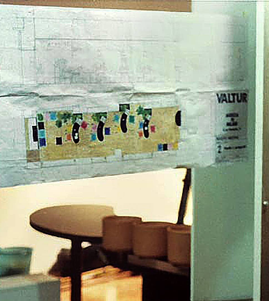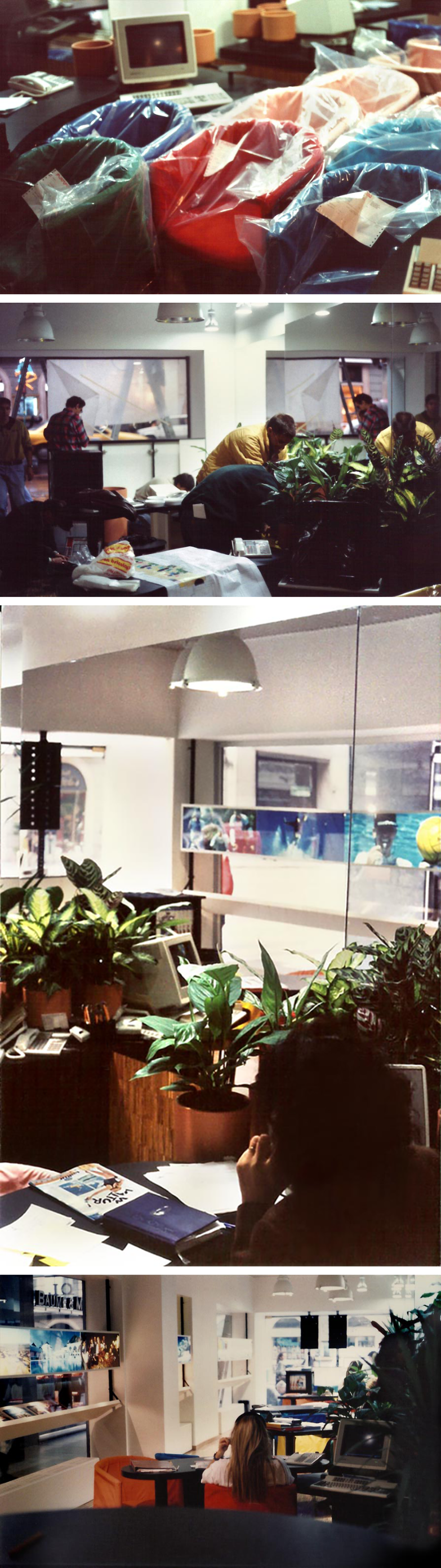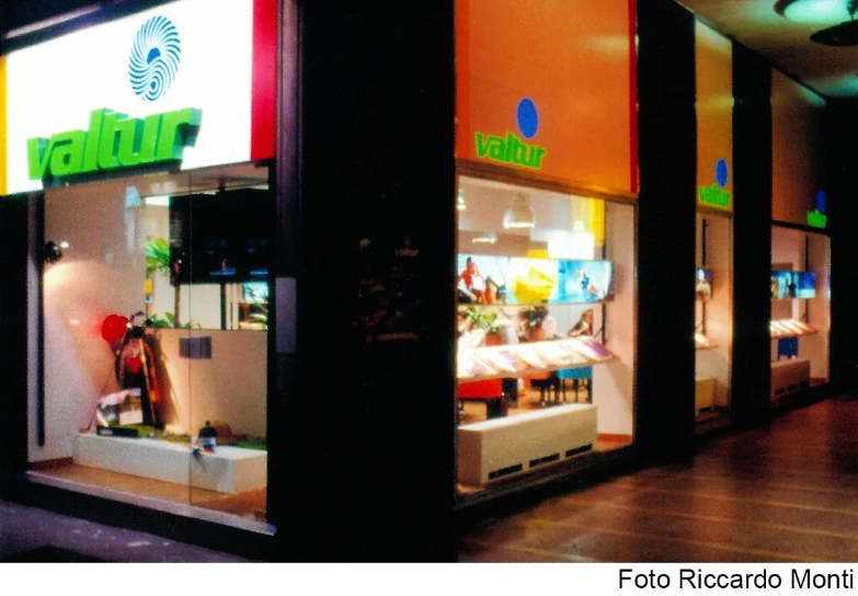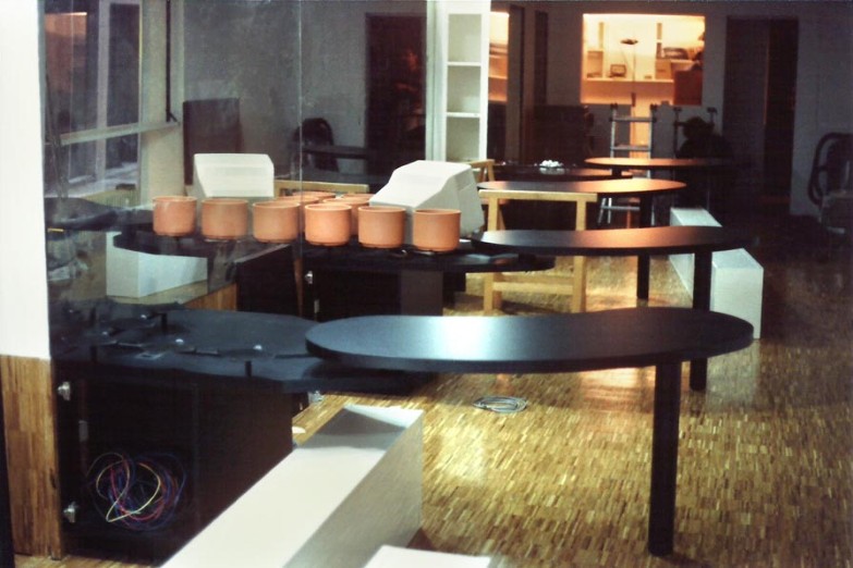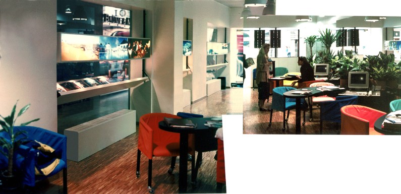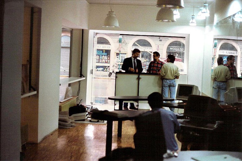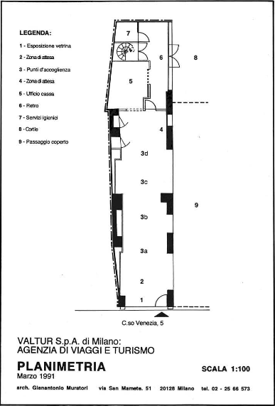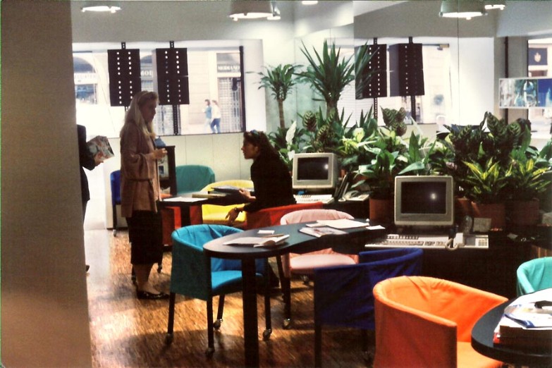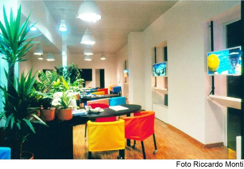 La zoccolatura, che va dagli specchi al pavimento, è realizzata con lo stesso tipo di legno della pavimentazione. Contigua allo spazio d'esposizione della vetrina c'è una zona d'attesa per i clienti, attrezzata con quattro poltroncine, un tavolino, una fioriera e un punto di distribuzione dei cataloghi. I punti di accoglienza sono costituiti da quattro scrivanie su cui trovano posto i terminali video, nascosti dal verde di numerose piante ornamentali; attorno ad esse vi sono dodici poltroncine di diversi e vivaci colori.