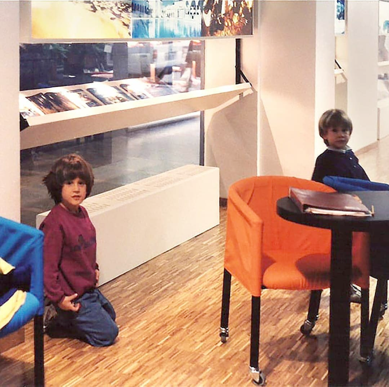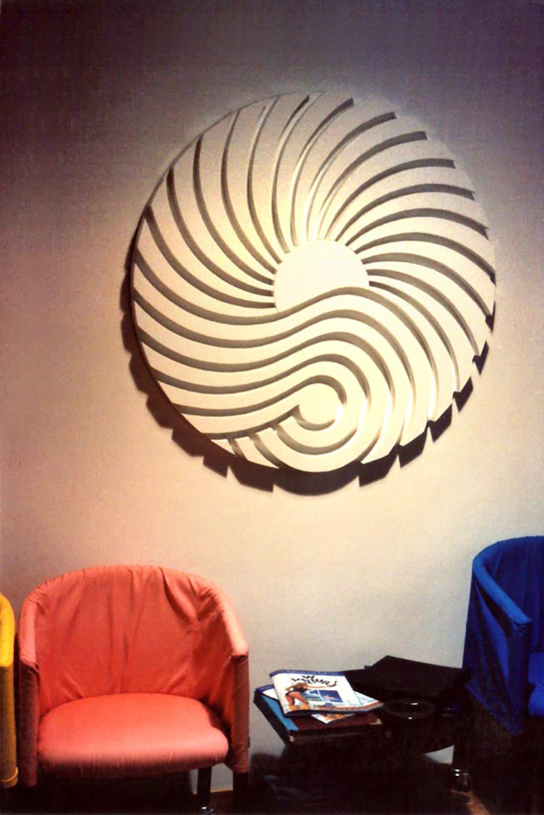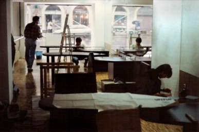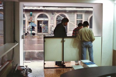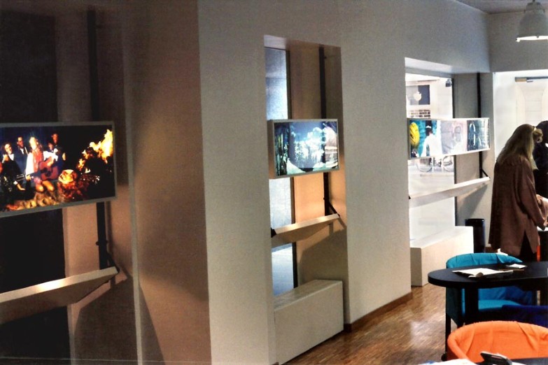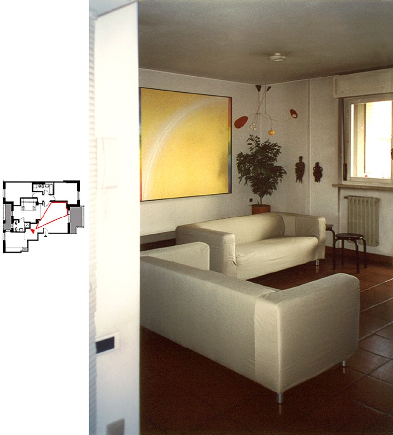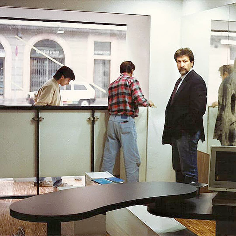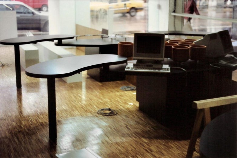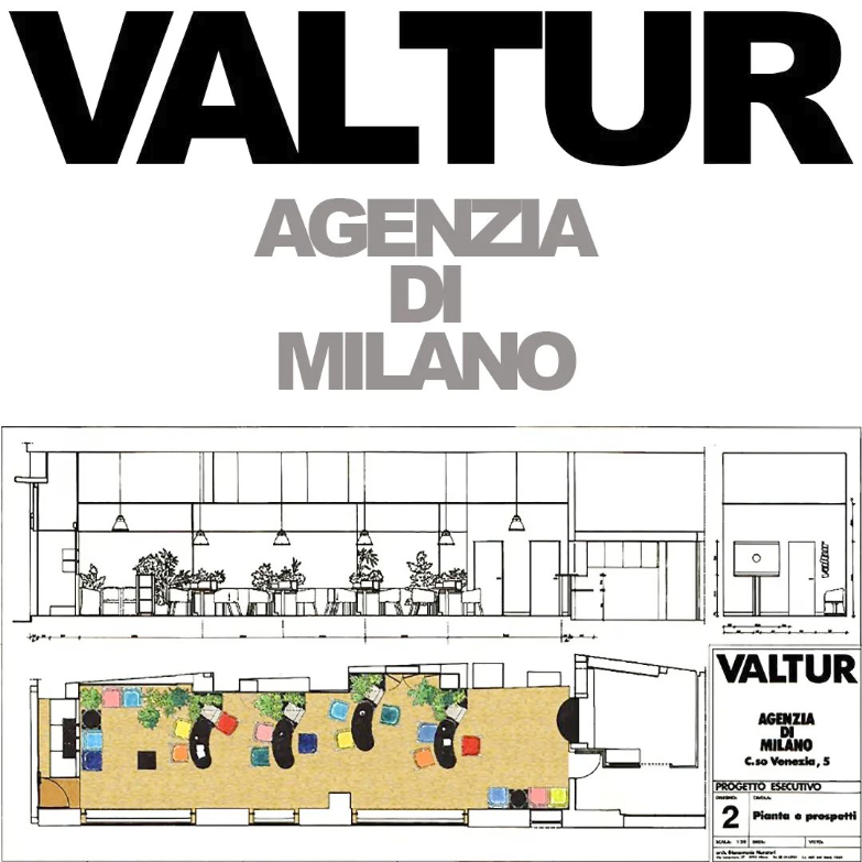 La zoccolatura, che va dagli specchi al pavimento, è realizzata con lo stesso tipo di legno della pavimentazione. Contigua allo spazio d'esposizione della vetrina c'è una zona d'attesa per i clienti, attrezzata con quattro poltroncine, un tavolino, una fioriera e un punto di distribuzione dei cataloghi. I punti di accoglienza sono costituiti da quattro scrivanie su cui trovano posto i terminali video, nascosti dal verde di numerose piante ornamentali; attorno ad esse vi sono dodici poltroncine di diversi e vivaci colori.