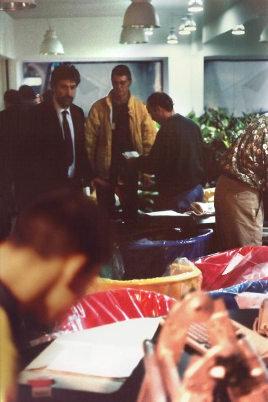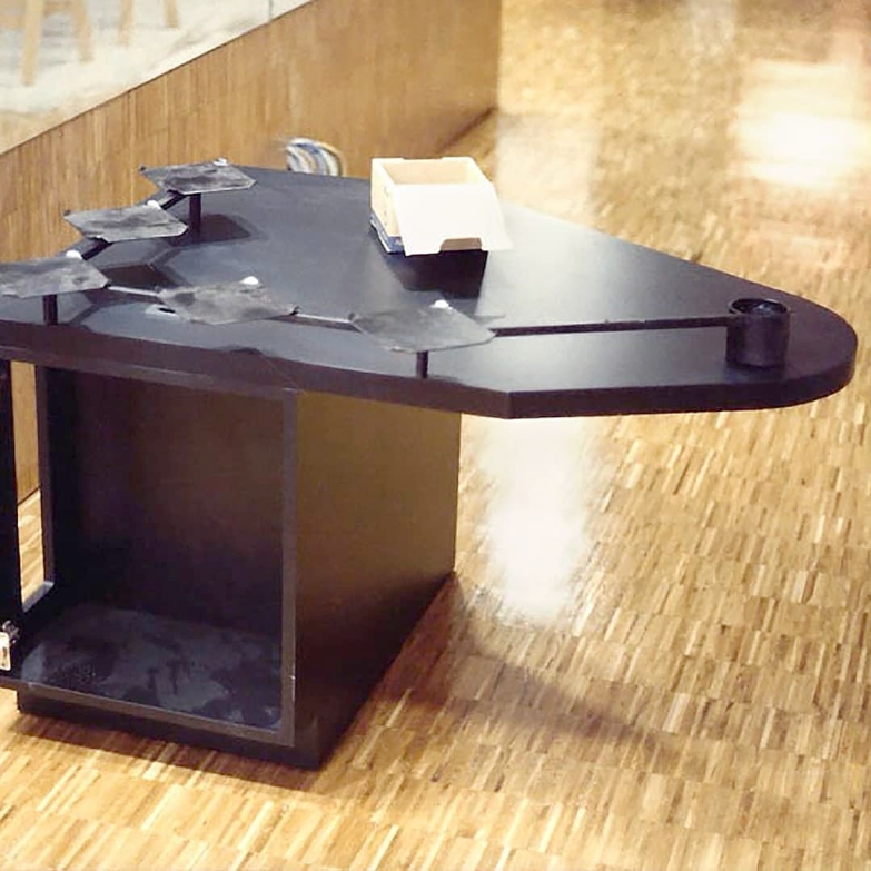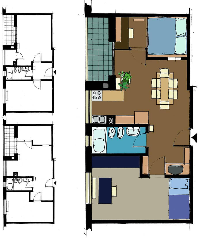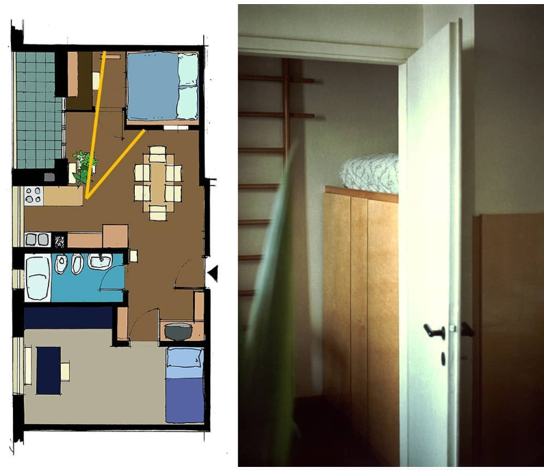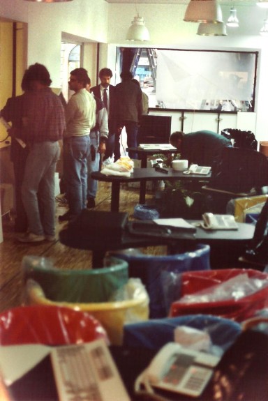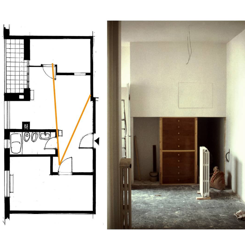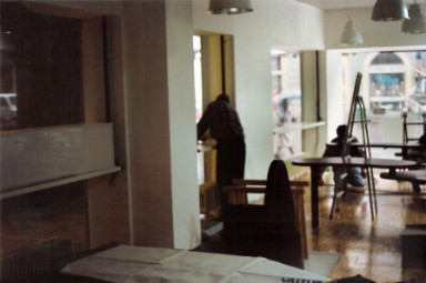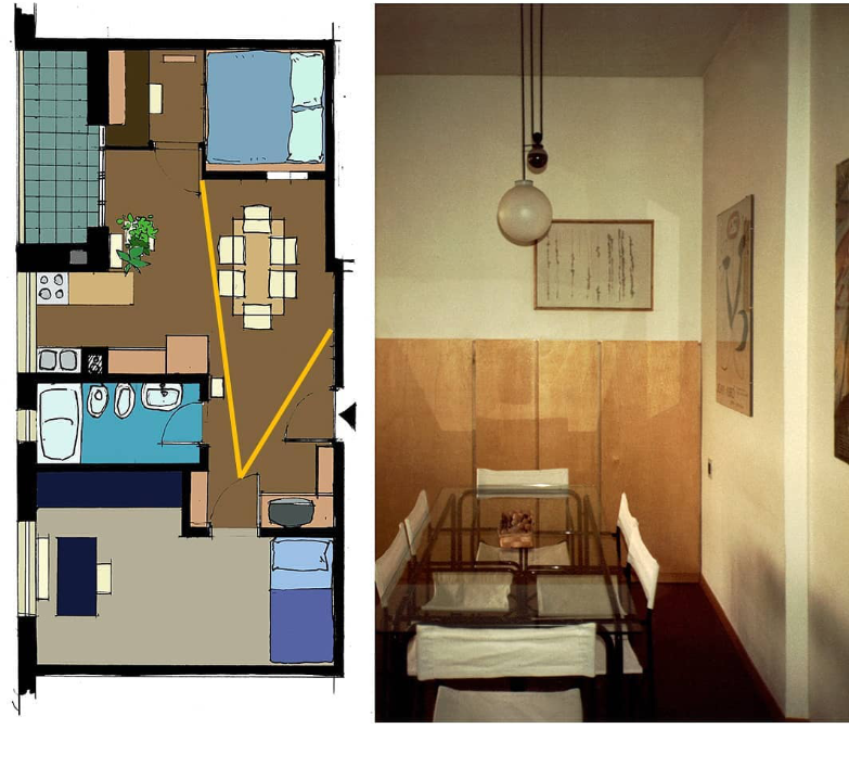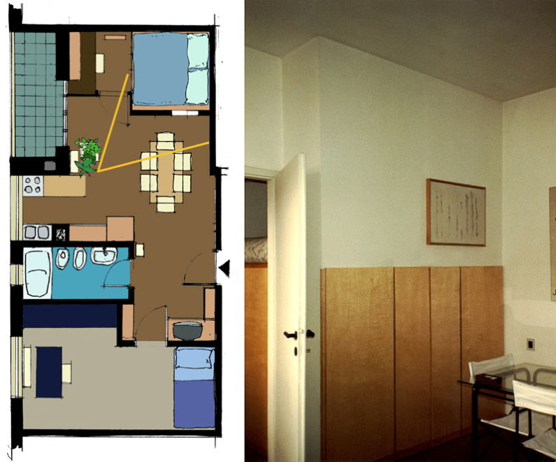 La zoccolatura, che va dagli specchi al pavimento, è realizzata con lo stesso tipo di legno della pavimentazione. Contigua allo spazio d'esposizione della vetrina c'è una zona d'attesa per i clienti, attrezzata con quattro poltroncine, un tavolino, una fioriera e un punto di distribuzione dei cataloghi. I punti di accoglienza sono costituiti da quattro scrivanie su cui trovano posto i terminali video, nascosti dal verde di numerose piante ornamentali; attorno ad esse vi sono dodici poltroncine di diversi e vivaci colori.